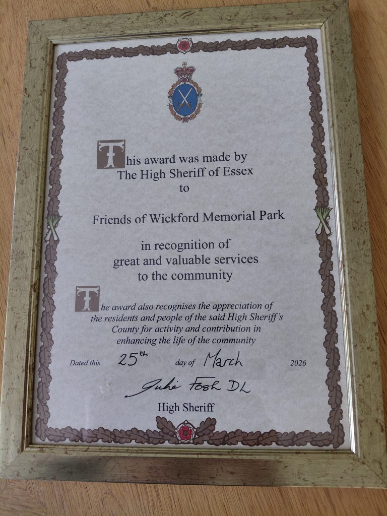 They were honoured to receive two prestigious awards. One for the Friends of the Wickford Memorial Park Volunteers and the other for the chair- Kim Oakes.