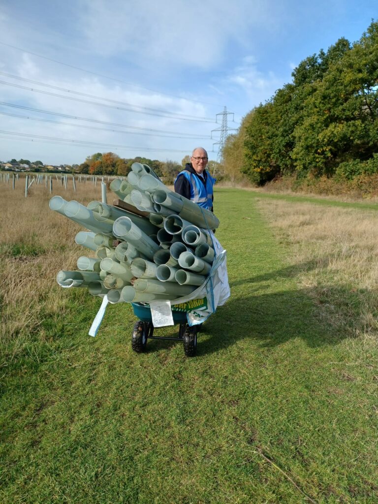 The council have a contract with a recycling company to recycle the plastic tree guards from around the park, especially the 3,500 trees that were planted on Beauchamps Meadow in 2021.
